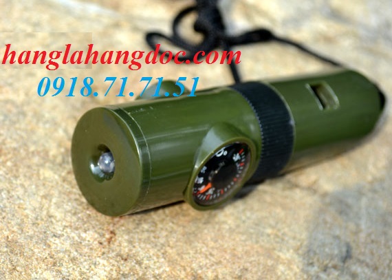 Còi sinh tồn đa năng gồm 7 chức năng: còi, la bàn, đèn pin, kính lúp, gương soi, nhiệt kế và khoảng trống để nhét các vật dụng quan trọng
